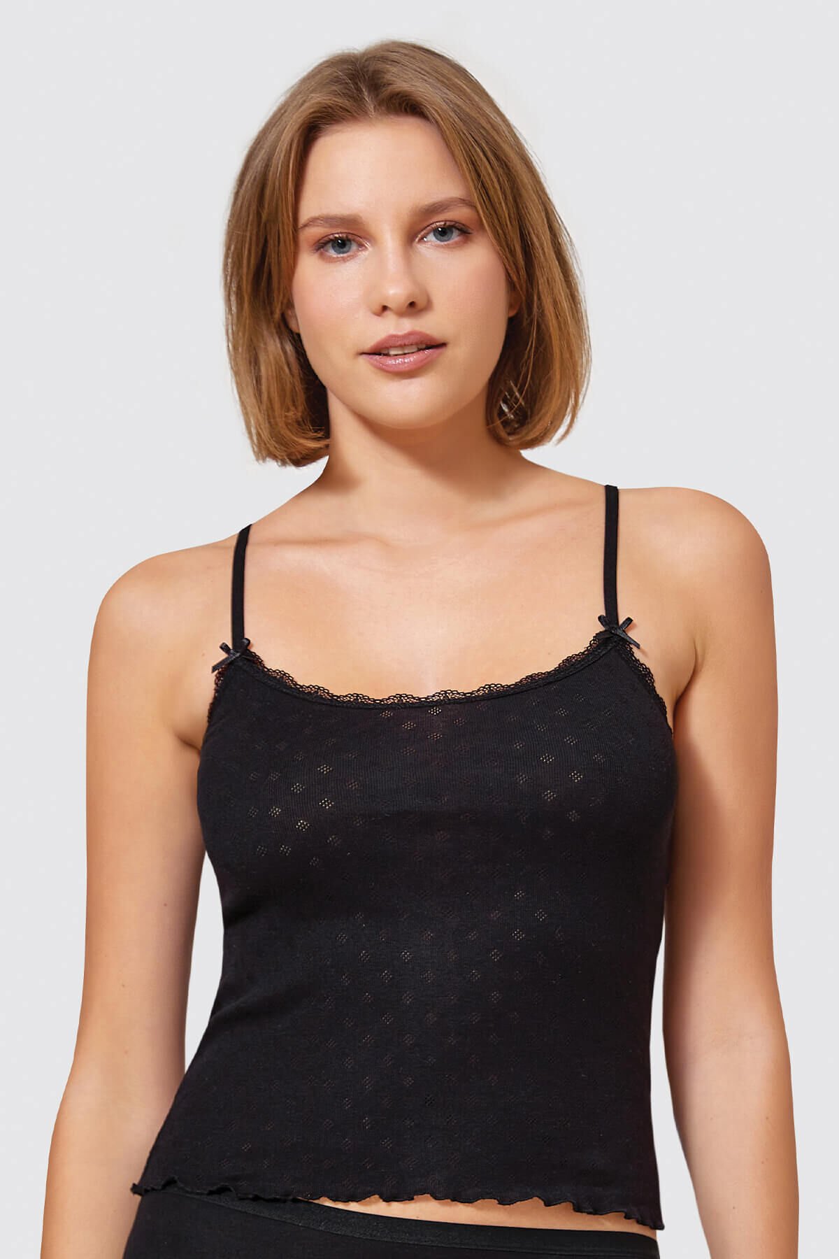 %100 pamuk kumaşından üretilen bu şık kadın atlet, zarif detaylarıyla gardırobunuzun en özel parçalarından biri olmaya aday. İnce askıları ve ön kısmındaki şık dantel tasarımı, atletinize feminen bir hava katarak stilinize zarif bir dokunuş ekler. Yaka kısmındaki şirin kurdela ise atletinize ek bir zarafet katarak göz alıcı bir detay sunar.