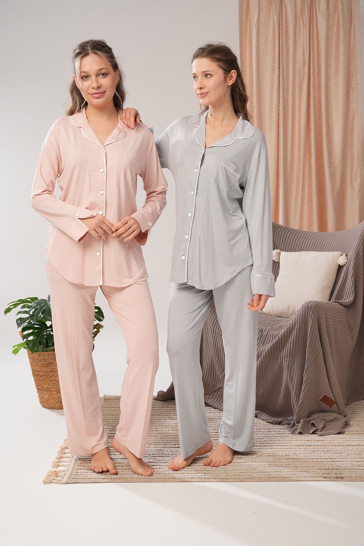 Bu muhteşem kadın pijama takımı, rahatlığı ve şıklığı bir arada sunuyor. Yumuşak dokusu ve rahat kesimiyle gece boyunca konforlu bir uyku deneyimi yaşamanızı sağlar. Aynı zamanda, şık tasarımıyla da göz dolduruyor. Uzun kollu üstü ve boydan düğmeli sizi hem sıcak tutacak hem de şık görünmenizi sağlayacak. Kaliteli kumaşı sayesinde uzun süre kullanabilirsiniz.