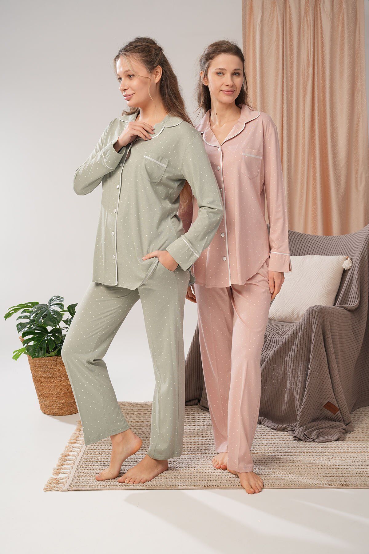 Bu muhteşem kadın pijama takımı, rahatlığı ve şıklığı bir arada sunuyor. Yumuşak dokusu ve rahat kesimiyle gece boyunca konforlu bir uyku deneyimi yaşamanızı sağlar. Aynı zamanda, şık tasarımıyla da göz dolduruyor. Uzun kollu üstü ve boydan düğmeli sizi hem sıcak tutacak hem de şık görünmenizi sağlayacak. Kaliteli kumaşı sayesinde uzun süre kullanabilirsiniz.