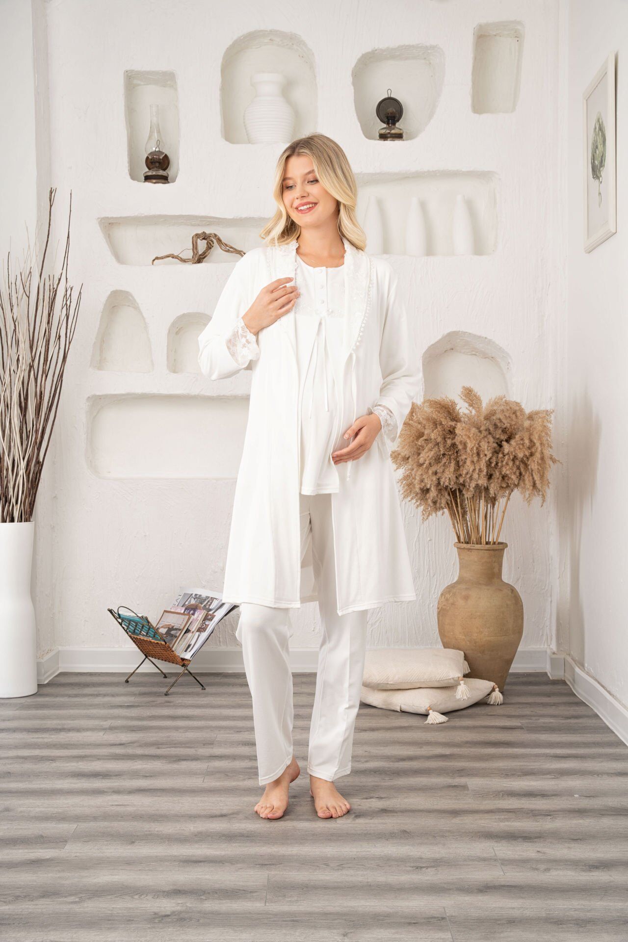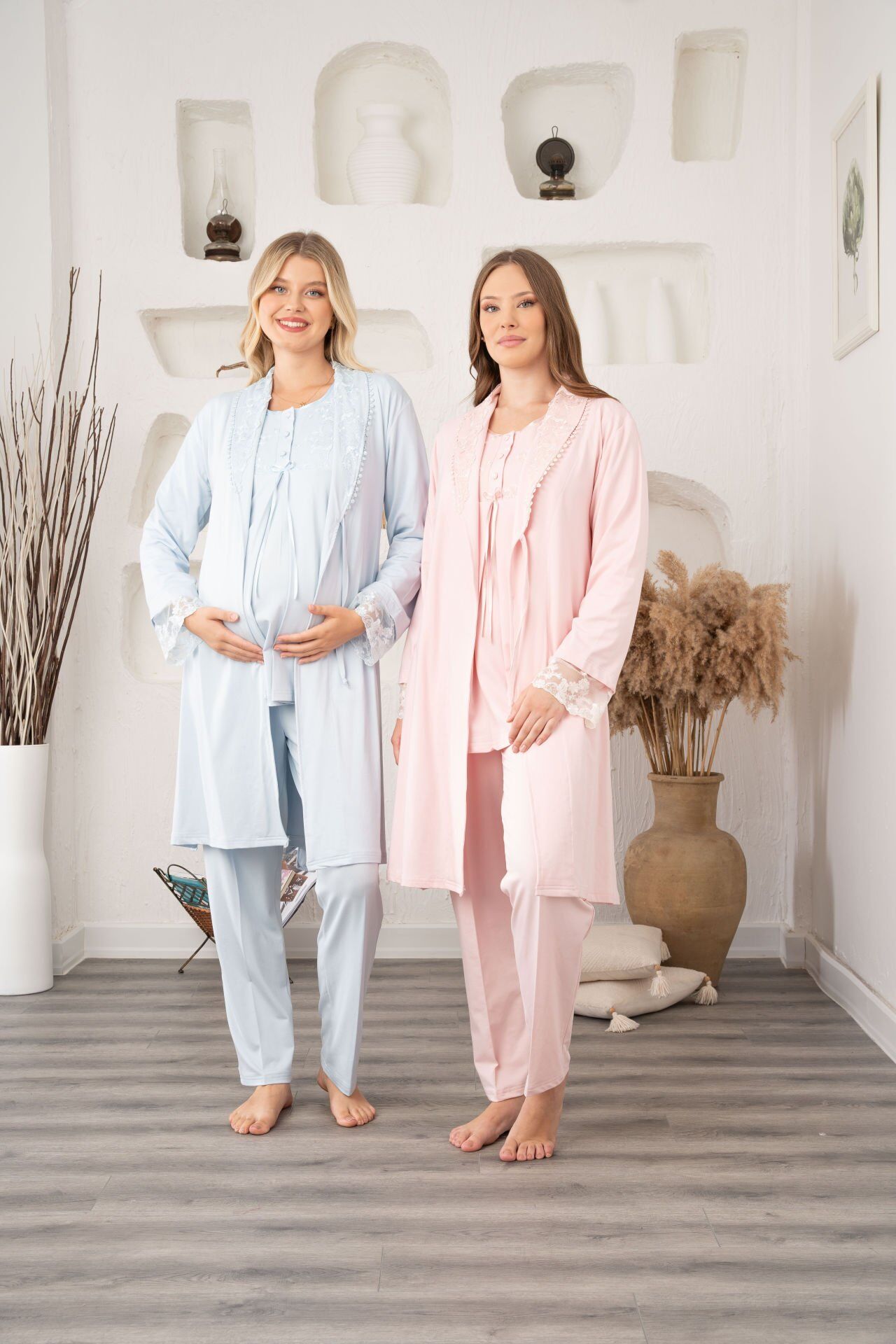 Bu sabahlıklı lohusa pijama takımı, annelerin rahat ve şık bir şekilde dinlenmelerini sağlar. Yumuşak kumaşı ve rahat kesimi ile hem bebeğe bakarken hem de dinlenirken konfor sağlar. Doğum sonrası için ideal bir seçimdir.