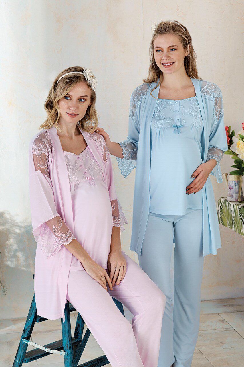 Hamilelik döneminde rahatça giyilebilen, Lohusa (emzirme) döneminde de özel kesimi sayesinde önü açılarak emzirme kolaylığı sağlayan sabahlıklı lohusa pijama takımı
