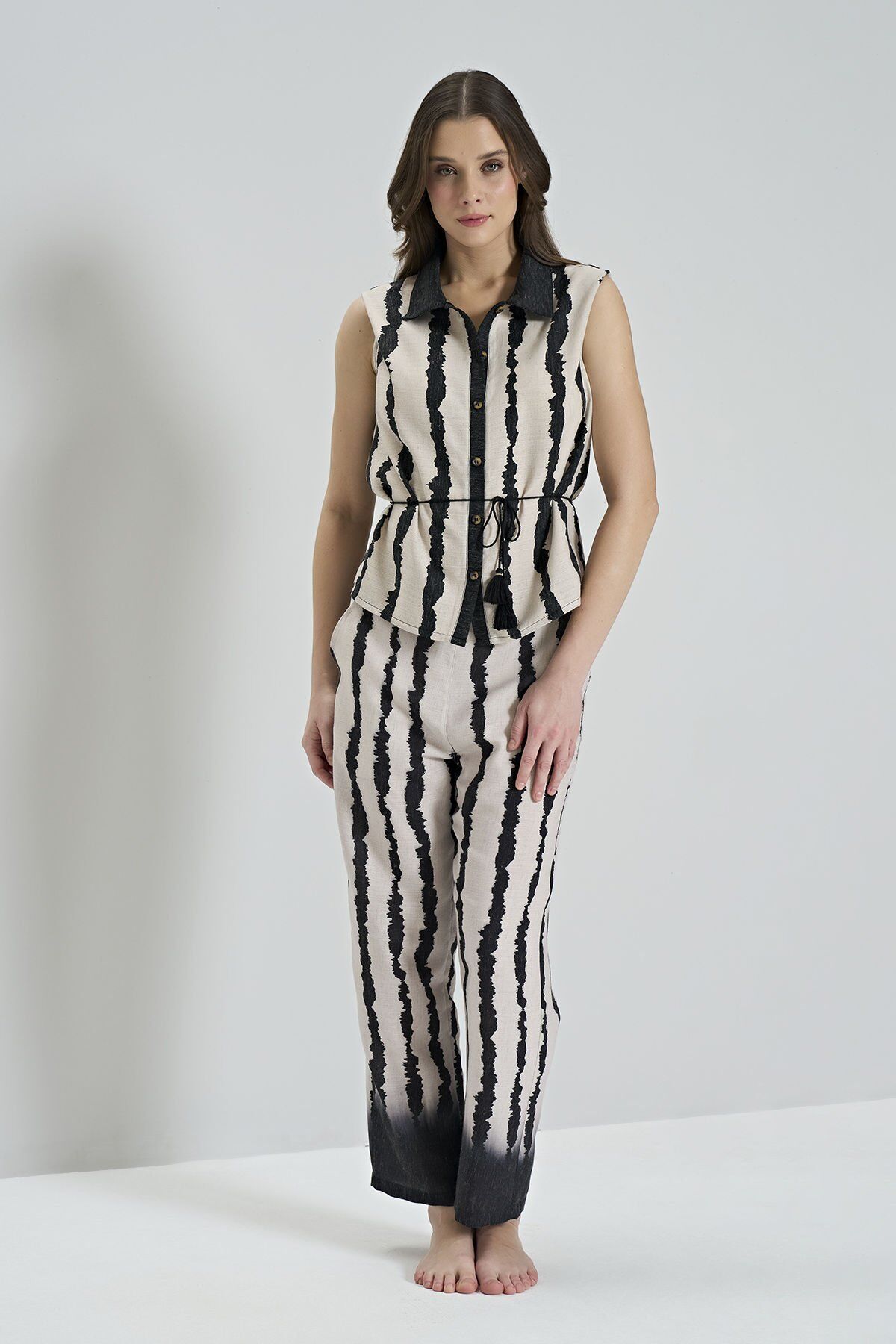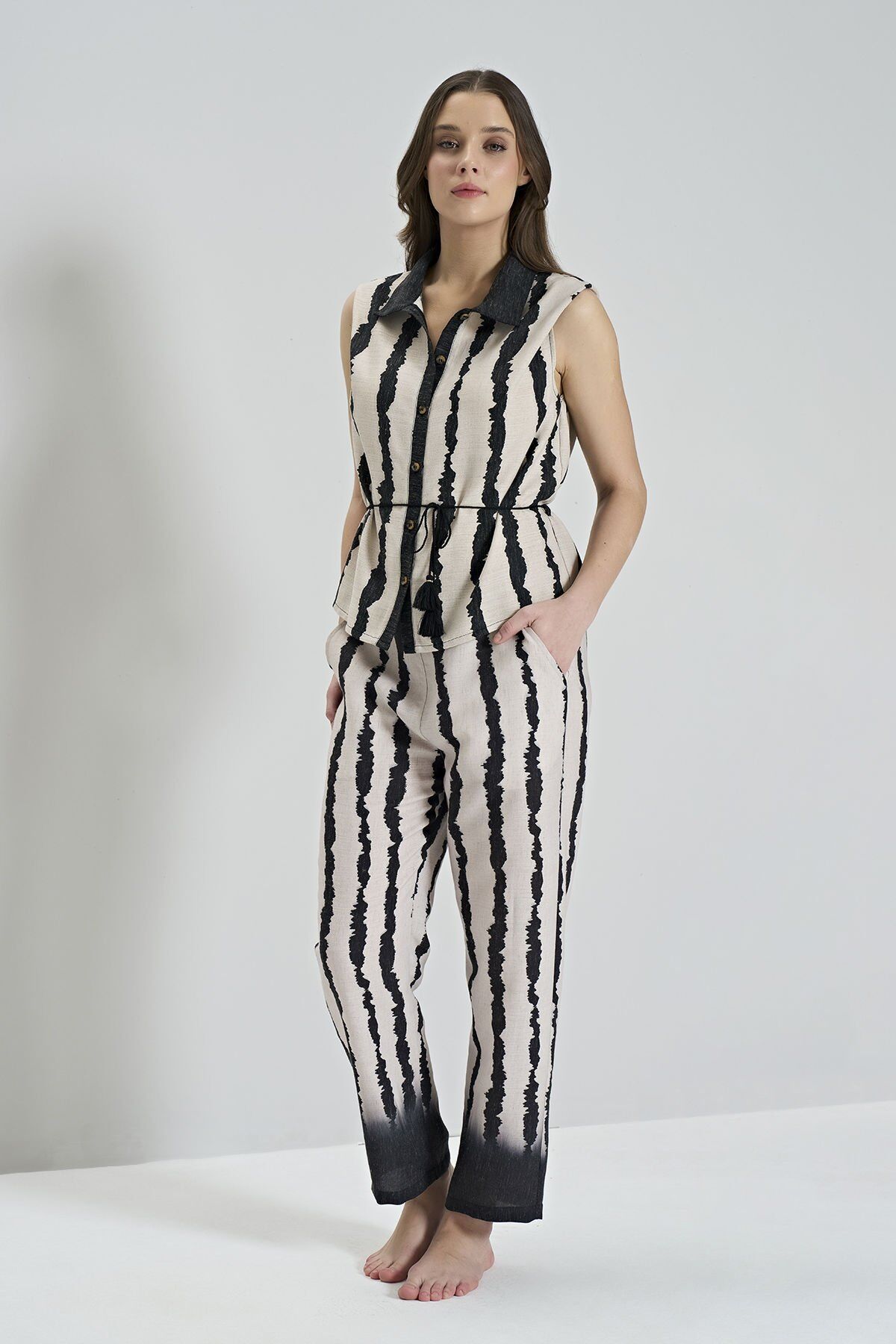 Bu rahat ve şık pijama takımı, kullanıcıya mükemmel bir uyku deneyimi sunar. Yumuşak kumaşı ve uygun kesimi ile konforlu bir kullanım sağlar.Sıfır kol boydan düğmeli tasarımı sayesinde rahatça giyilip çıkarılabilir. Her mevsim kullanıma uygun olan bu pijama takımı, hem gece hem de gündüz kullanılabilir.