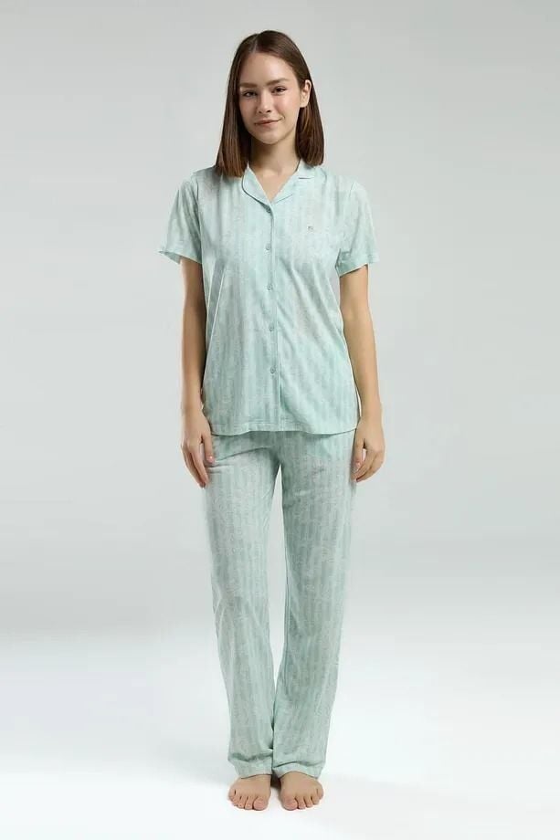Bu kısa kollu pijama takımı, %65 poliester ve %35 viskon kumaştan üretilmiştir. Rahat ve hafif yapısıyla gece boyunca konforlu bir uyku deneyimi sunar. Boydan düğmeli tasarımıyla kullanımı kolaydır ve şık bir görünüm sağlar. Her gün kullanıma uygun olan bu pijama takımı, hem şıklığı hem de rahatlığı bir arada arayanlar için ideal bir seçenektir.