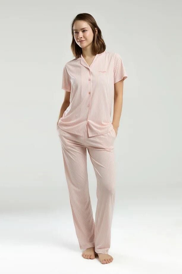 Bu kısa kollu pijama takımı, %65 poliester ve %35 viskon kumaştan üretilmiştir. Rahat ve hafif yapısıyla gece boyunca konforlu bir uyku deneyimi sunar. Boydan düğmeli tasarımıyla kullanımı kolaydır ve şık bir görünüm sağlar. Her gün kullanıma uygun olan bu pijama takımı, hem şıklığı hem de rahatlığı bir arada arayanlar için ideal bir seçenektir.