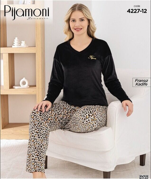 Kadife pijama takım, yumuşak dokusuyla rahatlığı ve şıklığı bir arada sunar. Soğuk havalarda sıcak tutan bu takım, evde konforlu ve zarif görünmek isteyenler için idealdir. Zarif kesimi ve özel kumaşıyla gece ve gündüz kullanıma uygundur.